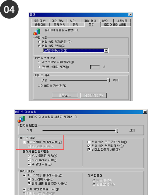 4.¿É¼ÇâÀÇ ¼º´ÉÅÇ¿¡¼­ "°í±Þ"À» ¼±Åà ÇÏ½ÅµÚ »õ·Î ³ªÅ¸³ª´Â ºñµð¿À°¡¼Ó ¼³Á¤ â¿¡¼­ "ºñµð¿À ¹Í½Ì ·»´õ·¯ »ç¿ë" Ç׸ñÀÇ Ã¼Å©¸¦ ÇØÁ¦ ÇÑ ÈÄ "È®ÀÎ"À» Ŭ¸¯Çϼ¼¿ä.