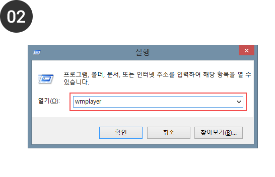 2.¶ç¿öÁø â ÀÔ·Â ºÎºÐ¿¡ "wmplayer" ¶ó°í ¾´ ÈÄ È®ÀÎÀ» ´©¸£½Ê½Ã¿ä. ¹Ìµð¾îÇ÷¹À̾î âÀÌ ¶å´Ï´Ù.