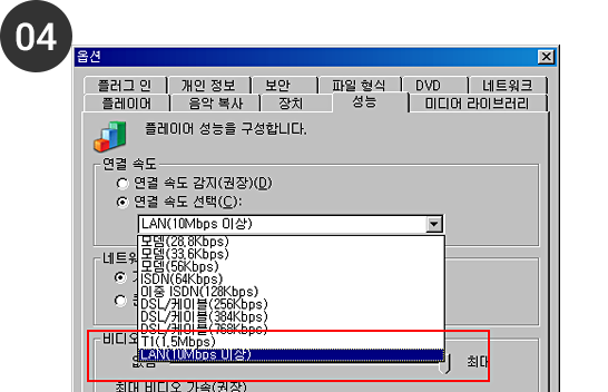 4.¿É¼ÇâÀÇ ¼º´ÉÅÇ¿¡¼­ "¿¬°á ¼Óµµ ¼±ÅÃ" Ç׸ñ Áß "LAN(10Mbps ÀÌ»ó)"À» ¼±Åà ÇÏ½ÅµÚ "È®ÀÎ"À» Ŭ¸¯Çϼ¼¿ä.