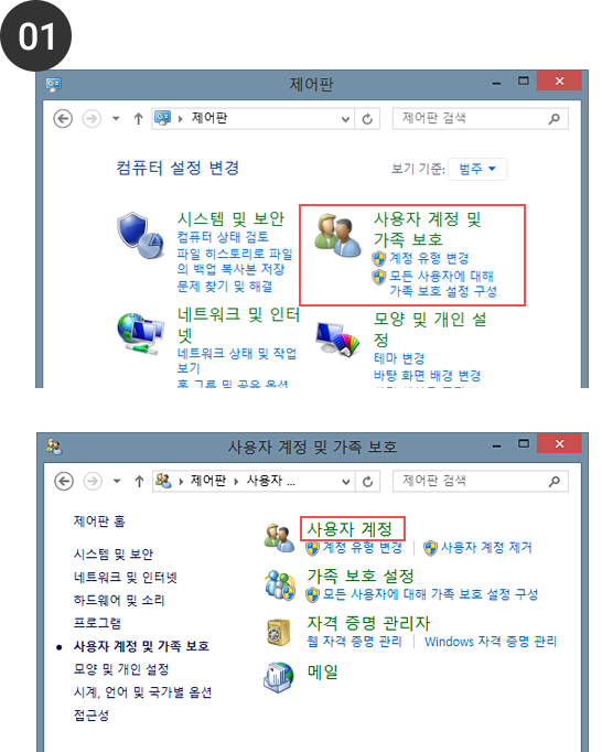 1.Á¦¾îÆÇÀ» ½ÇÇà½Ã۰í "»ç¿ëÀÚ°èÁ¤ ¹× °¡Á·º¸È£"¸¦ ¼±ÅÃ, ´Ù½Ã "»ç¿ëÀÚ°èÁ¤"À» ¼±ÅÃÇϼ¼¿ä.