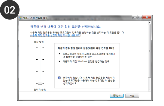 2.»ç¿ëÀÚ°èÁ¤ º¯°æ Áß¿¡¼­ "»ç¿ëÀÚ°èÁ¤ ÄÁÆ®·Ñ ¼³Á¤ º¯°æ" À» ¼±ÅÃ, "»ç¿ëÀÚ°èÁ¤ ÄÁÆ®·Ñ ²ô±â" ¶Ç´Â ½½¶óÀ̵带 "¾Ë¸®Áö ¾ÊÀ½"À¸·Î º¯°æÇϼ¼¿ä.
